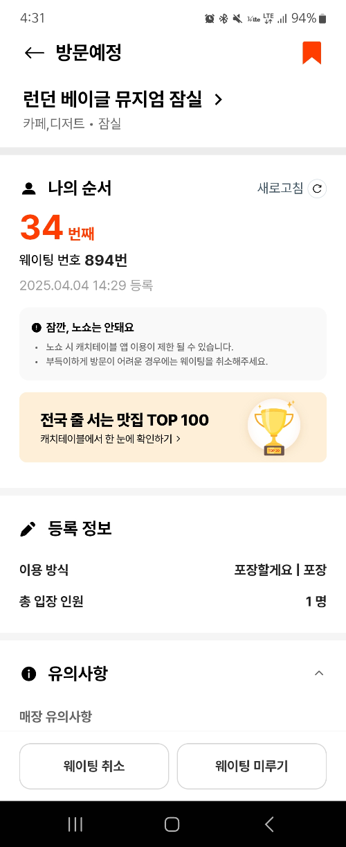 • 캐치테이블 앱을 통해 미리 웨이팅 등록이 가능하니 적극 활용하세요.